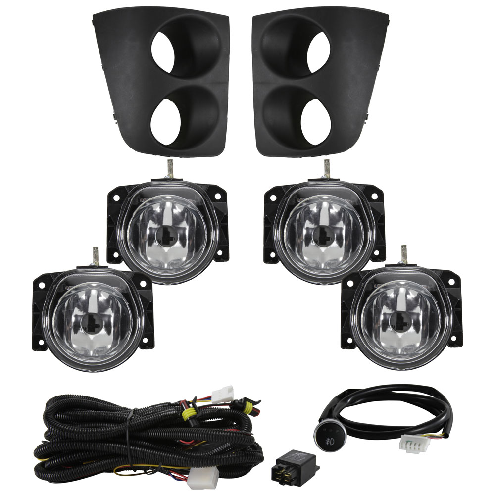 CONTEÚDO: 04 Faróis Auxiliares, 02 Grades, 04 Suportes, 01 Chicote, 01 Relê, 01 Botão Interruptor